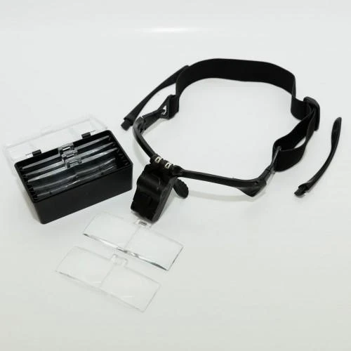 1 – 5 x Glass Lens allowing choices for different magnification.  2 – The LED Light source emitts brightness at adjustable angles.  3  – The Lens angle is adjustable to direct the brightness to a specific area.    4 –  Frames can be changed to a headband to ensure a more comfortable and tight wearing fit.